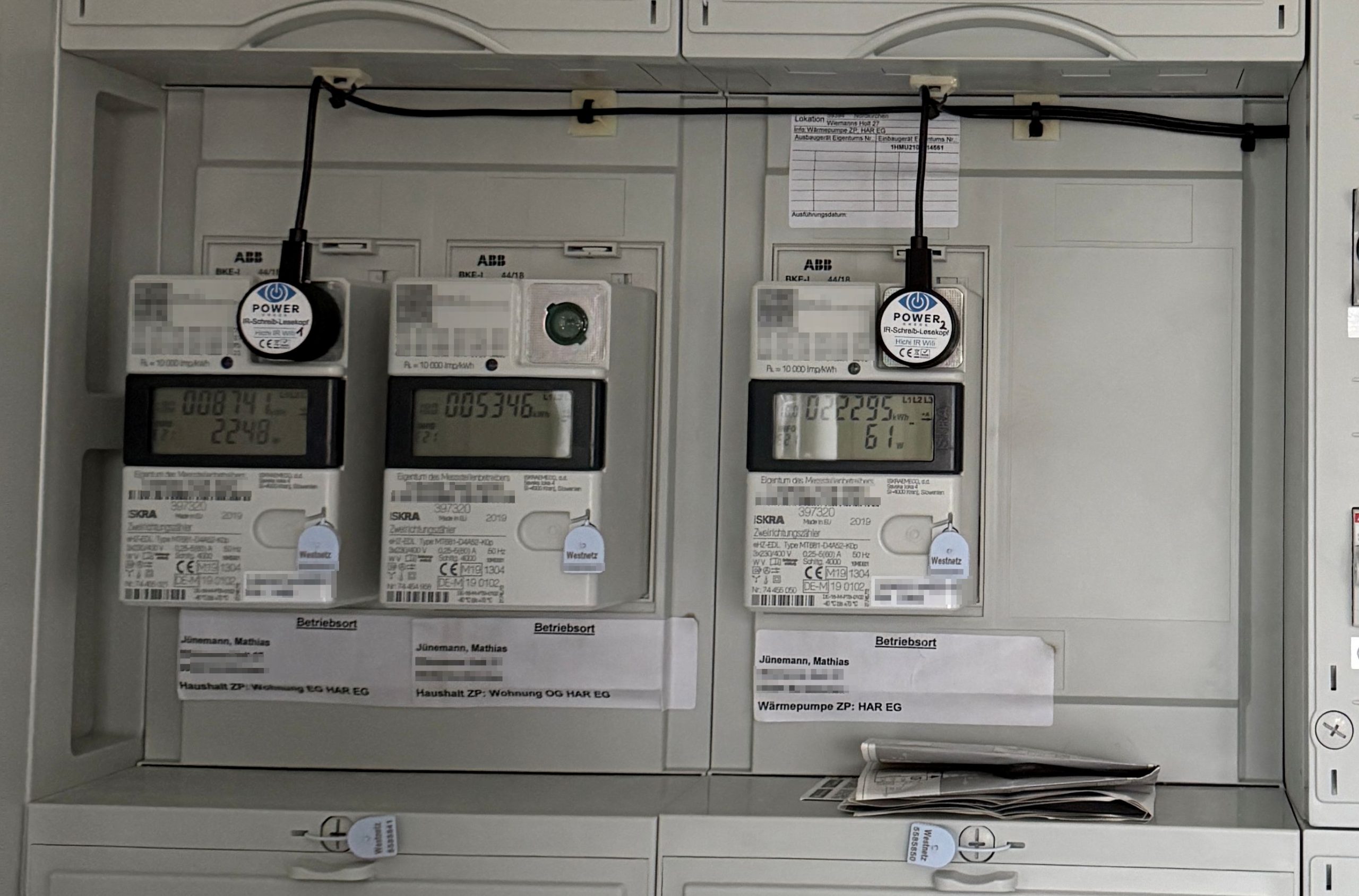 Um die Energieverbräuche meines Haushalts und der Wärmepumpe im Blick behalten zu können, sollten deshalb zwei Zähler mit einem Lesekopf ausgestattet werden. Der Zähler für die Mietwohnung bleibt außen vor, zumal der Mieter ohnehin direkt mit dem Energieversorger abrechnet.