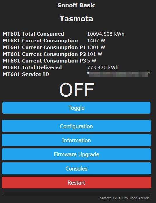 Die auf dem Lesekopf befindliche Tasmota-Version sollte nicht über den Button „Firmware Upgrade“ aktualisiert werden, da der reinen Tasmota-Distribution die Codes für das Auslesen von Stromzählern fehlen.